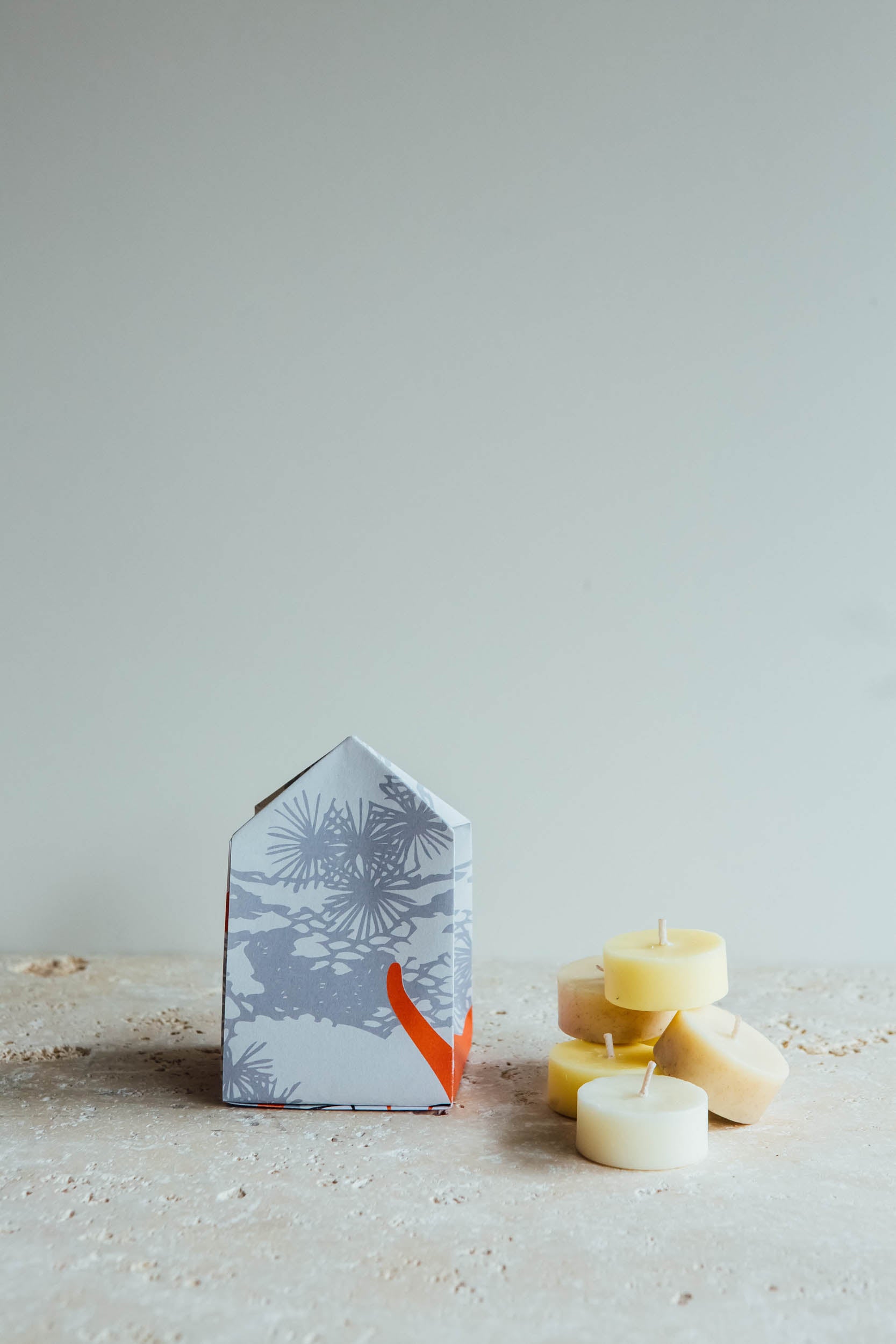 This set includes three tea light refills presented in a handmade origami bag that can be reused or recycled after use.